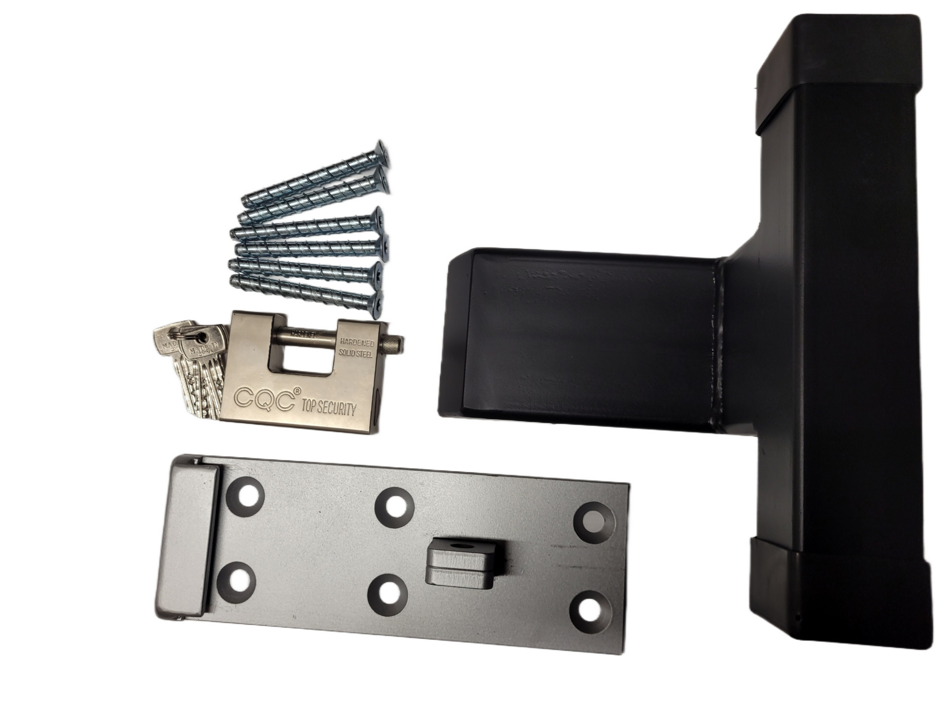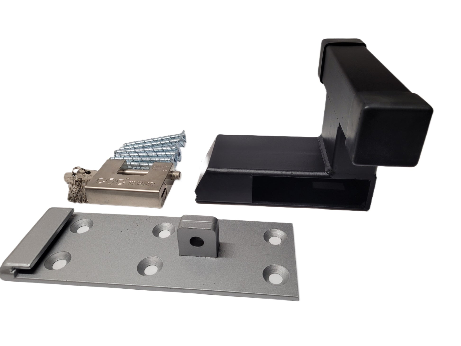 Garage Door Defender Lock Kit - Provides greater safety and security effectively preventing thieves and intruders from opening your garage door. The Defender is made of super strong alloy steel that has been fully hot dipped galvanized to stand tough against weather, rain, ice, and more. This won't rust or corrode while looking good and working smoothly for years of excellent performance. This comes with heavy duty padlock and 3 keys. We also include all the needed hardware for fast, easy fit and installation. Made in the UK to the very highest standards of safety and quality. Painted black outer goes well with most colour schemes and designs.